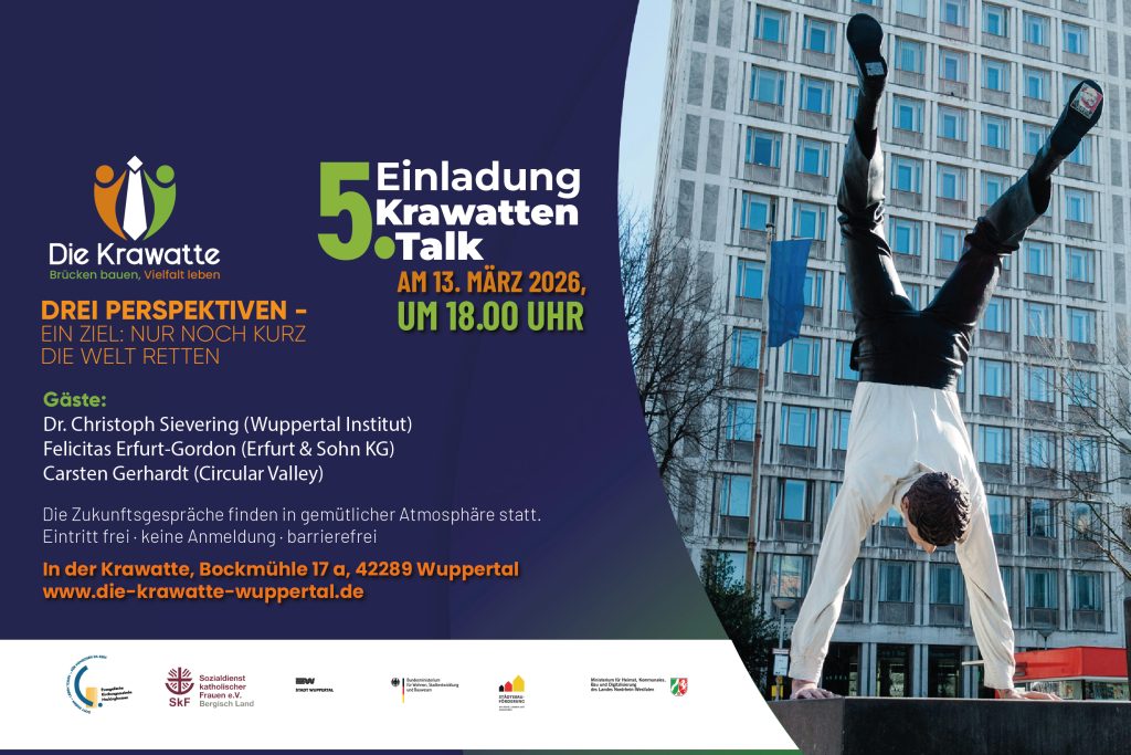 auch beim nächsten Krawatten Talk geht es um ein großes Thema: „Nur noch kurz die Welt retten.“ Und wieder geht es darum, welche Lösungen in Wuppertal gemacht, geplant und gedacht werden. Dafür stehen drei Perspektiven von drei Menschen, die sich diesem Ziel verpflichtet fühlen. Zu Gast beim KrawattenTalk sind diesmal Felicitas Erfurt-Gordon von der Erfurt & Sohn KG, Dr. Christoph Sievering vom Wuppertal Institut und Dr. Carsten Gerhardt vom Circular Valley.